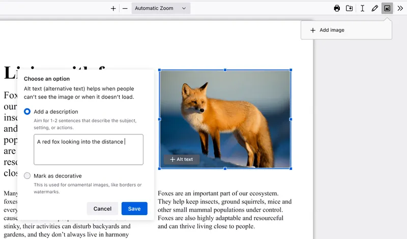 Open the PDF in Firefox. Click the image icon, which will then prompt you to upload an image. Adjust size and placement of your image as needed. Click the "+Alt text" button on the image to add a photo description to make your PDF more accessible.