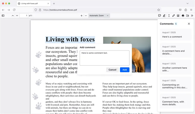 Open the PDF in Firefox. Create a highlight, then click the Comment icon that appears below your selection, type your comment, and click Add to save. Lots of comments in a PDF? Click the Comment icon in the top right to open the sidebar and jump to the one you need.