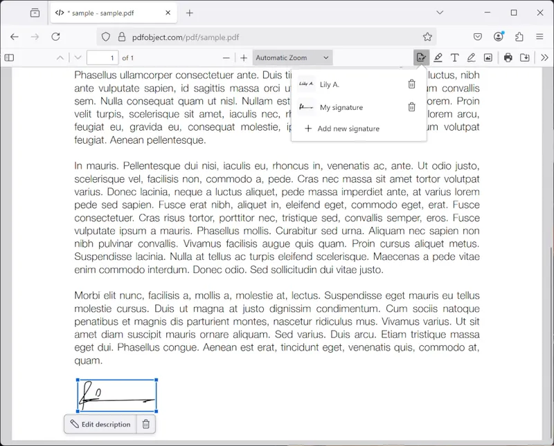 Open the PDF in Firefox. Click the signature icon and then click "Add new signature". Choose between Type, Draw or Image, and click the Add button to insert. You can also save your signatures and use them again later.